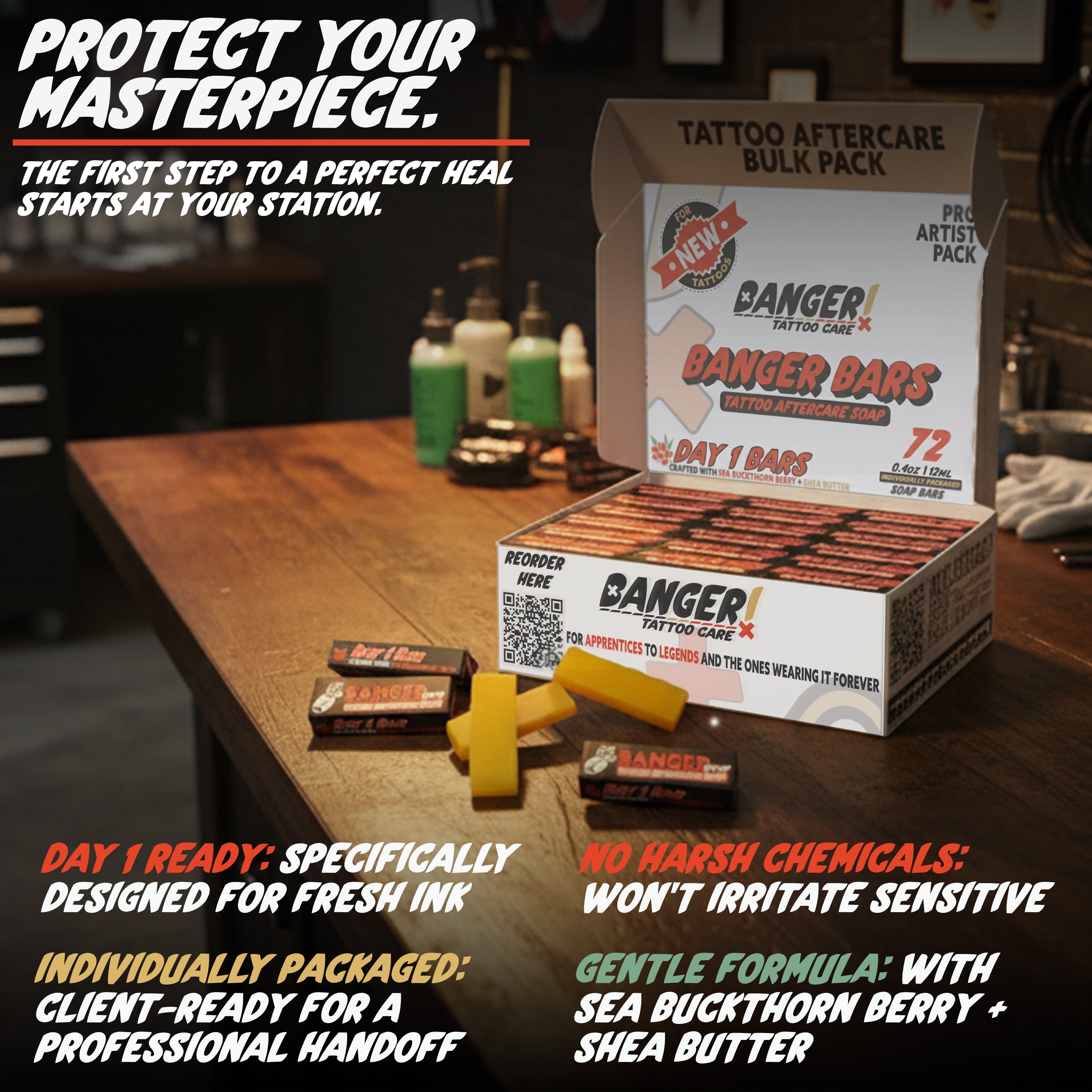The first 24-48 hours are the most critical for a tattoo's healing. The Banger Case: Day 1 Edition allows you to standardize this crucial step for every client. By providing our specialist "Calms + Cleanses" formula, you eliminate the guesswork and ensure your work is protected from harsh soaps from the moment a client leaves your chair. This is the professional's choice for guaranteeing a perfect start to the healing process.